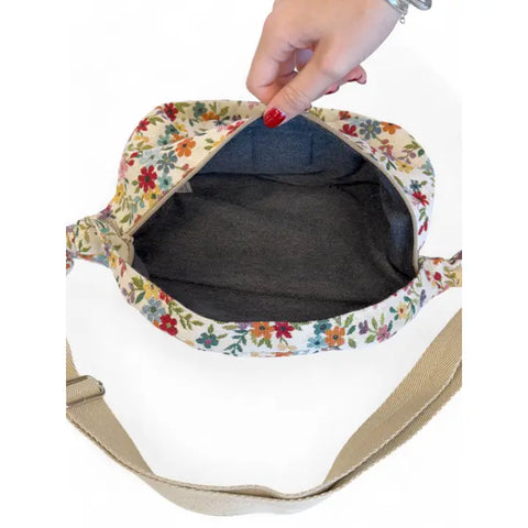 This fanny pack combines function with a timeless floral design. Made with a thick jacquard fabric in a beige background and detailed with a soft floral print, it offers durability and style in one piece. The adjustable strap is crafted from beige cotton webbing for a comfortable fit, while a secure top zipper keeps essentials safe. Inside, the pack is fully lined with sturdy gray fabric for added structure and reliability. Measuring 12.2 x 13 inches, it provides ample room for carrying daily necessities while staying lightweight and easy to wear. Available at Poppins on Mackinac Island.